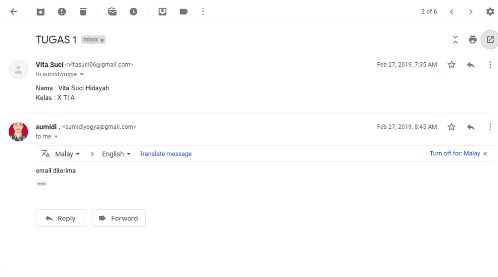 Setelah membuat e-mail, masing-masing siswa mengirimkan pesan kepada Pak Sumidi guna untuk memberitahukan akun e-mail yang sudah siap.